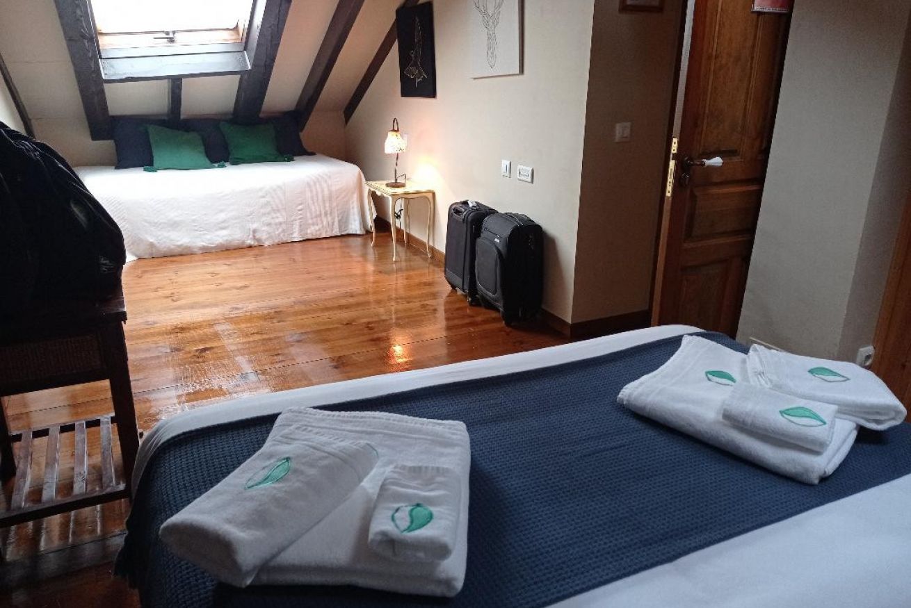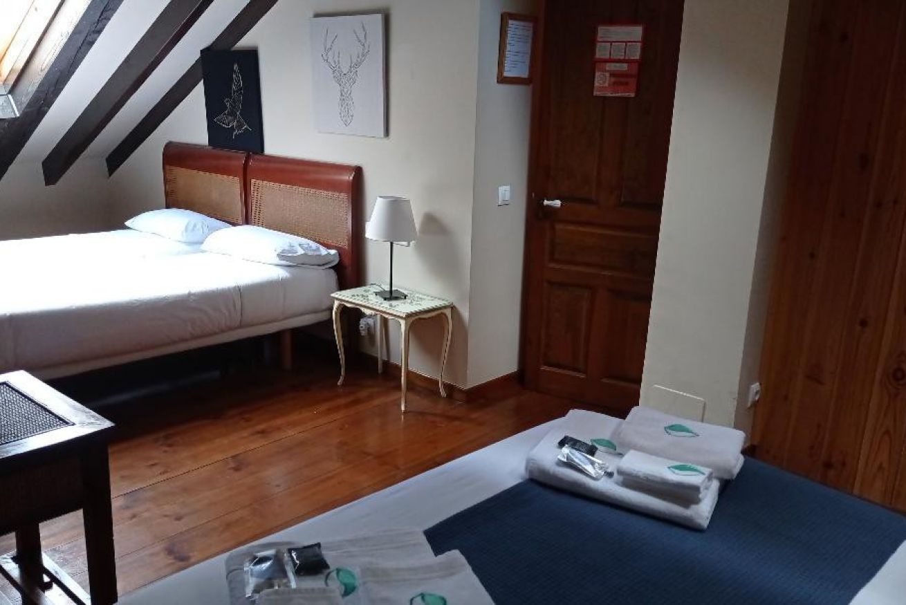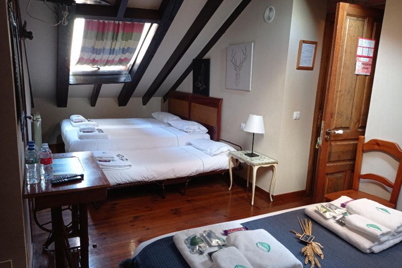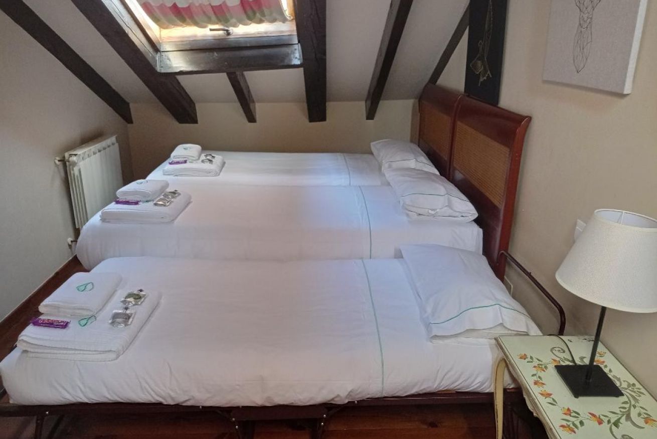 Habitación con cama de matrimonio y 2 camas individuales.